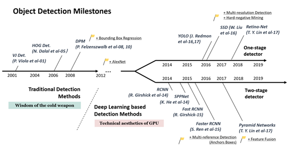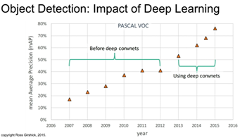 Object detection 분야의 전통적인 dataset이라고 할 수 있는 PASCAL VOC를 기준으로 했을 때 2012년에 AlexNet의 등장으로 Deep Learning이 본격적으로 활용되면서, Object detection 분야에도 효과적으로 활용되기 시작했다.