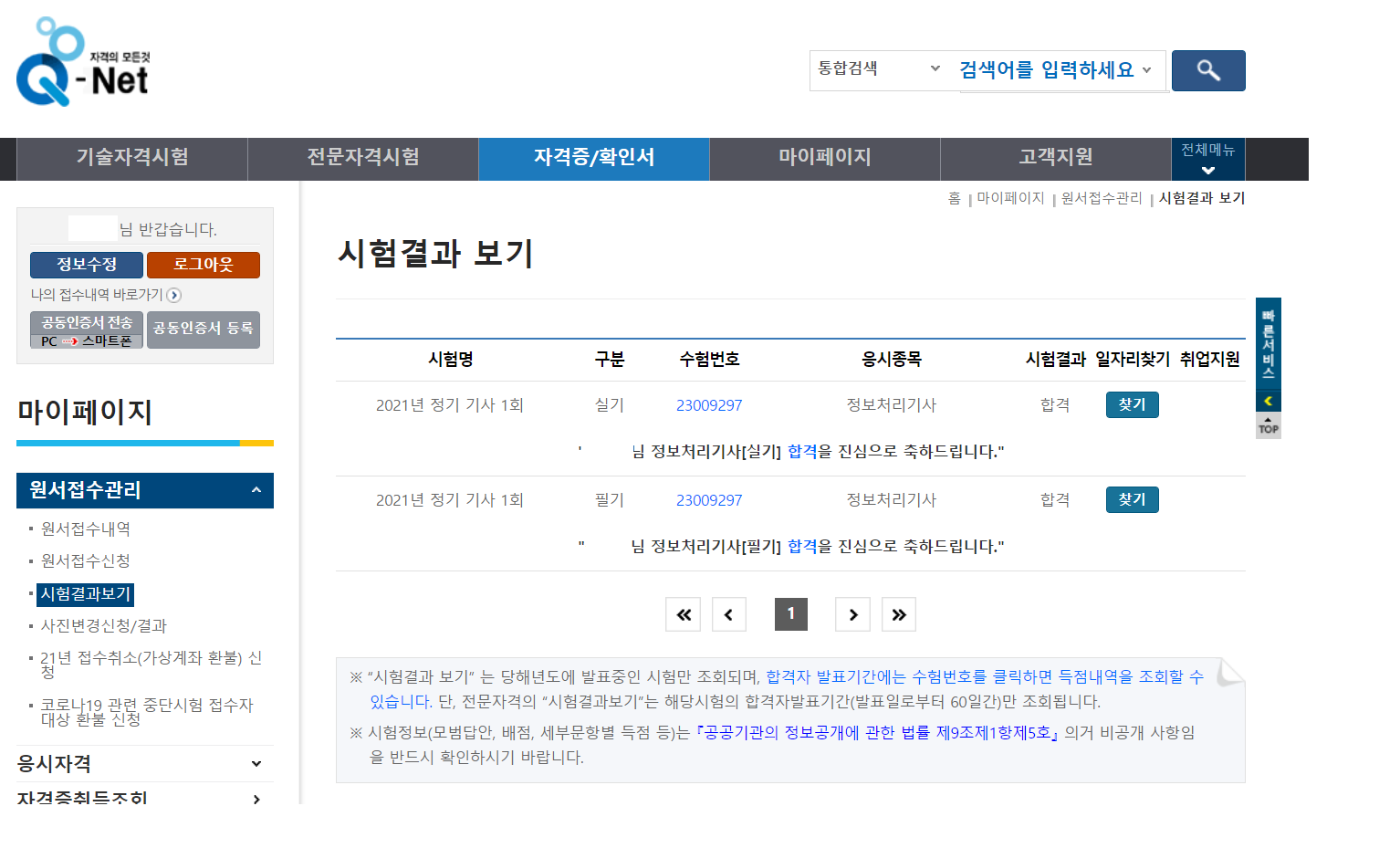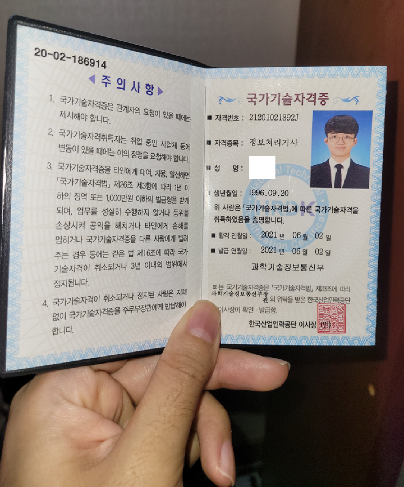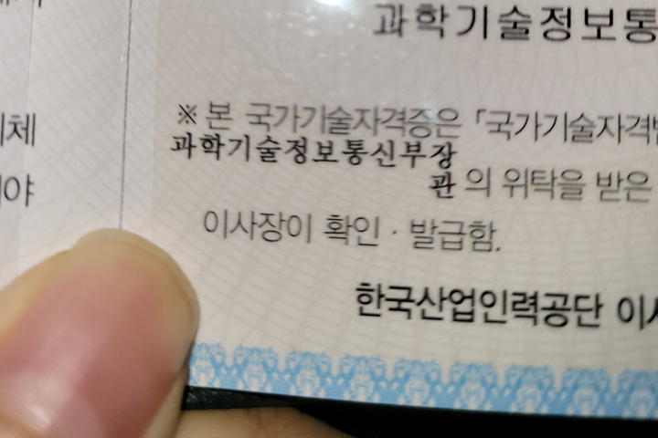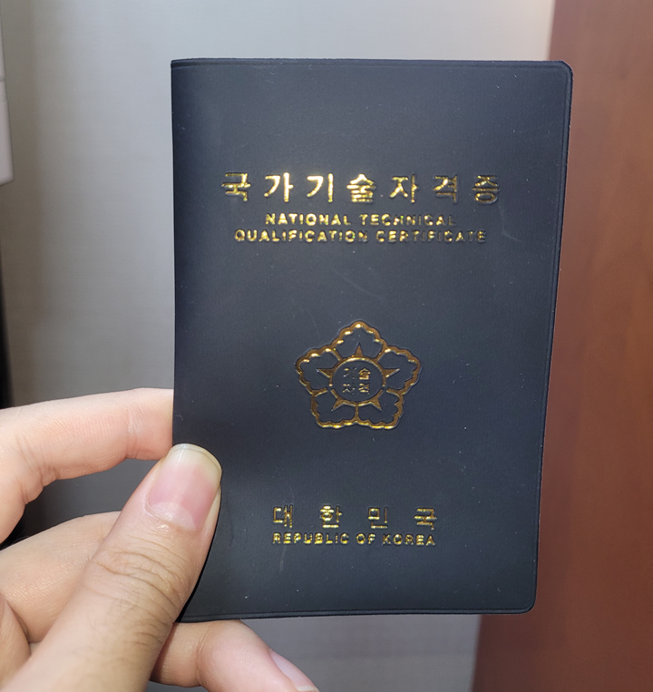 자격증은 요로코롬 생겼다. 사실 상장형이 표준이라서 무료로 발급받을 수 있는데, 괜시리 받아보고 싶어서 돈 조금 내고 수첩형도 주문했다. 국가기술자격증이라니.. 조금 뽀대가 나는 것 같기도..