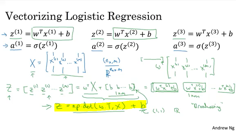 forward propagation 에서 Z에 관한 식을 만들 때 쓰인다. numpy.dot을 이용하여 만든 \[{\bf{z}} = {{\bf{w}}^T}{\bf{X}} + b\]는 (feature number , number of training data) 의 shape 을 가진 matrix가 되는데(이전의 cat-classification을 예로 들면 feature의 수는 64*64*3=12288, training data는 학습을 위해 준비된 이미지 수), 여기에서 상수 b를 결합될 때 b가 broadcasting된다.
