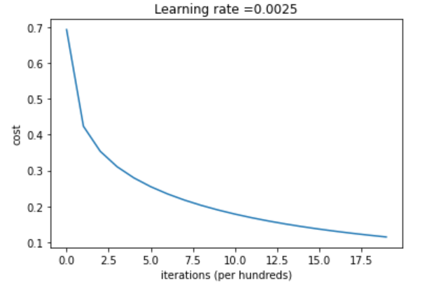 learning rate=0.0025일 때 iteration에 대해서 cost가 낮아지는 것을 위 그래프가 보여준다.