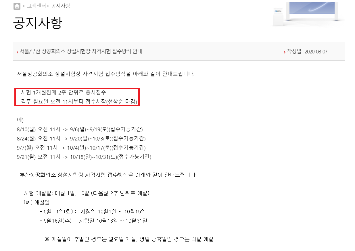 서울/부산 상공회의소의 경우 8월 7일 부로 접수방식이 변경되었어요. 2주 단위로 월요일 11시에 접수를 하는데, 오늘(8/24)이 접수일이었습니다! 다음 접수일은 9월 6일이 되겠네요. 선착순 접수이기 때문에 대학교 수강신청 때처럼 순발력이 있어야 시험을 볼 수가 있습니다..ㅠㅠ