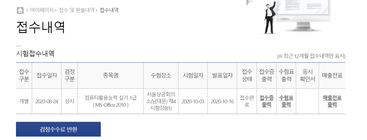 결제를 마치시면, 수험표 출력란에서 접수가 잘 됐는지 확인할 수 있습니다.