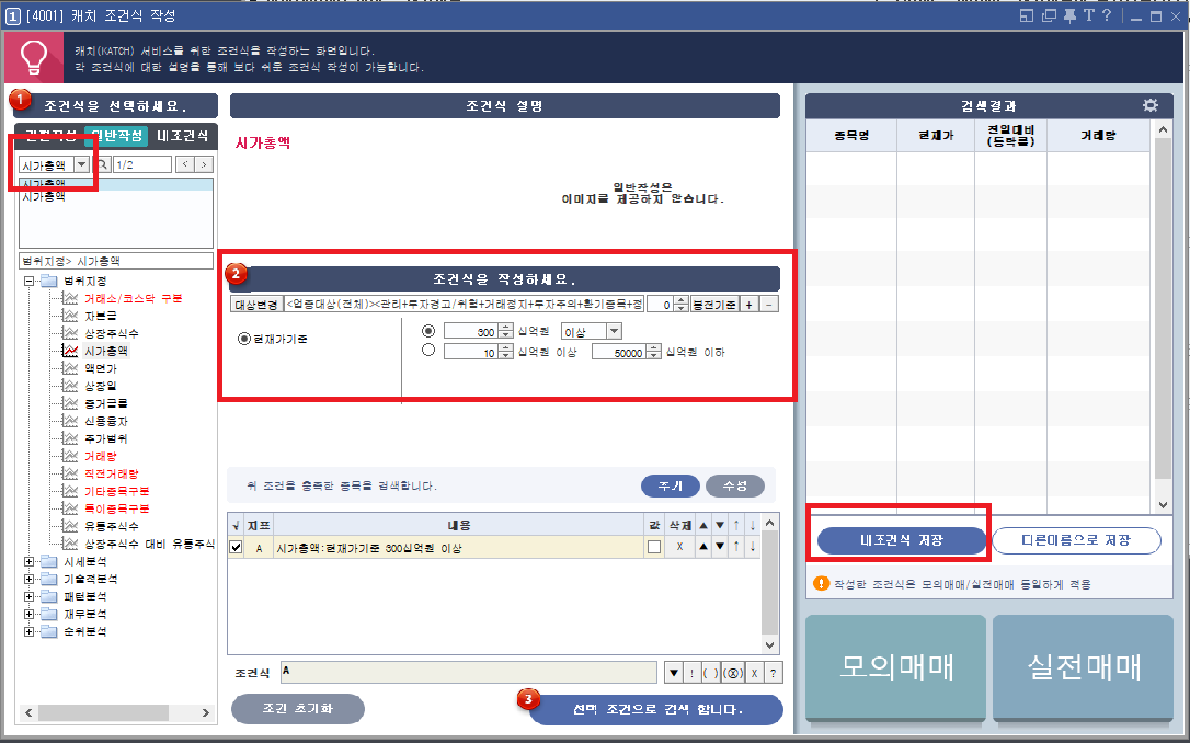 4. 만든 조건식으로 종목을 거래를 할 수 있습니다. 모의매매 또는 실전매매를 누르면 주문에 관한 설정을 정하고 매매를 시작할 수 있습니다.