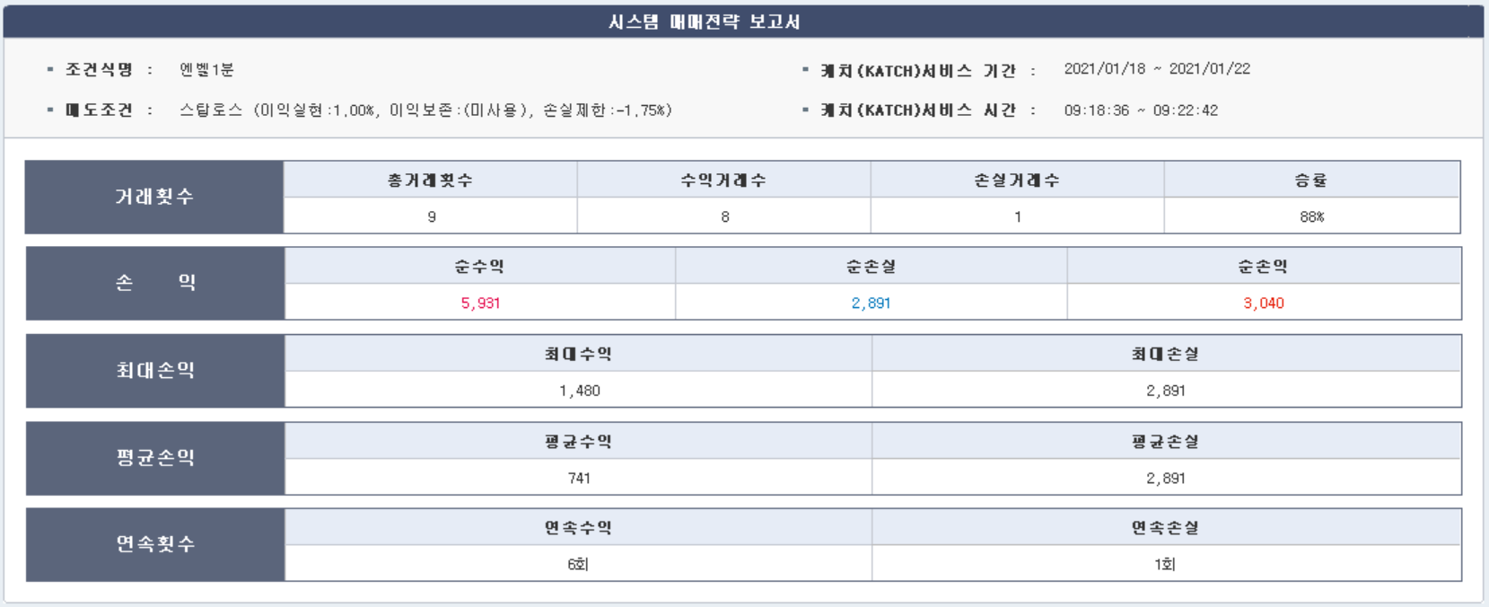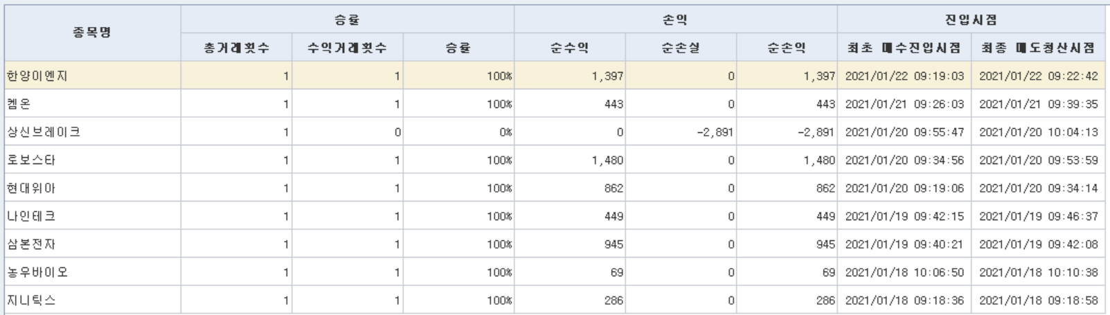 4080원에 들어가서 4010원에 나왔는데, 당일 종가는 3715원으로 잘 나온 것이 맞지만 이틀 뒤인 1월 22일에 고가 6100원 종가 5060원이네요.개잡주 손절된 이유는 크게 2가지인데 생각보다 개미털기가 더 심했고 당일 최초포착일 때 들어가지 않았기 때문입니다. 이 문제를 해결하기 위해 다음날 3종목까지 동시에 포착을 할 수 있도록 셋팅해뒀지만 모두 익절했음에도 동시 보유라는 상황은 발생하지 않았네요. 그리고 여기서 손절가를 조금 좁혀야 할 필요도 느꼈습니다.