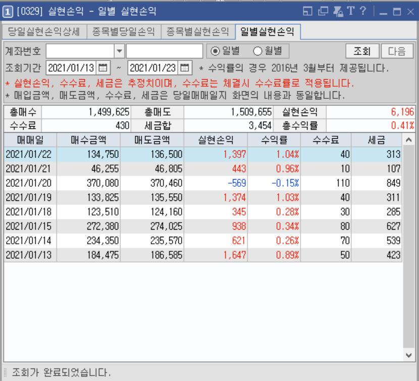 이전 포스팅에서 15만원으로 매수가를 증액하겠다고 했는데, 결론부터 말하자면 20일, 21일, 22일에는 15만원으로 거래를 했고 20일에 2승 1패를 하면서 손실(-500원정도)이 났습니다. 손실종목을 분석해보고 21일에는 15만원을 5만원씩 최대 3종목까지 동시 포착이 가능하도록 했지만 결국 동시포착이 되는 일은 없었고, 다시 22일에 거래할때는 최초 1종목만 포착하도록(하루 1번만 매수하기) 하여 익절했습니다.
